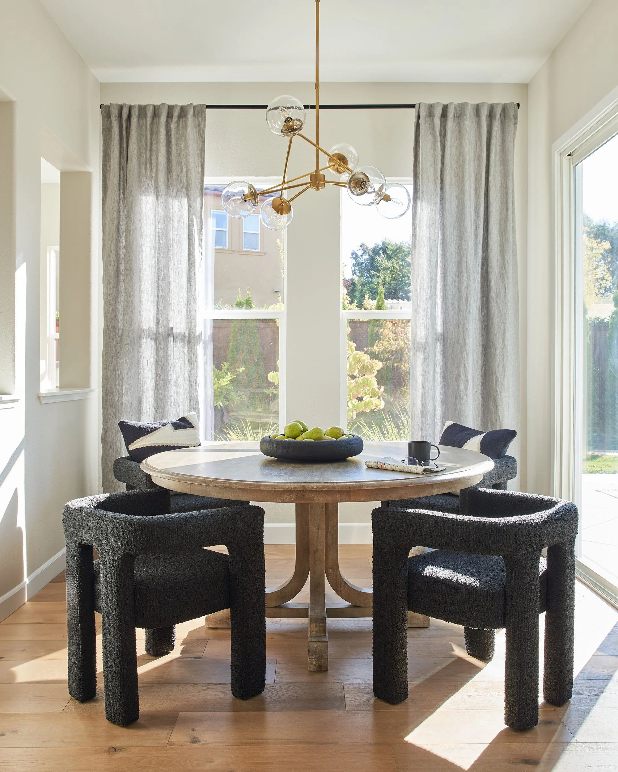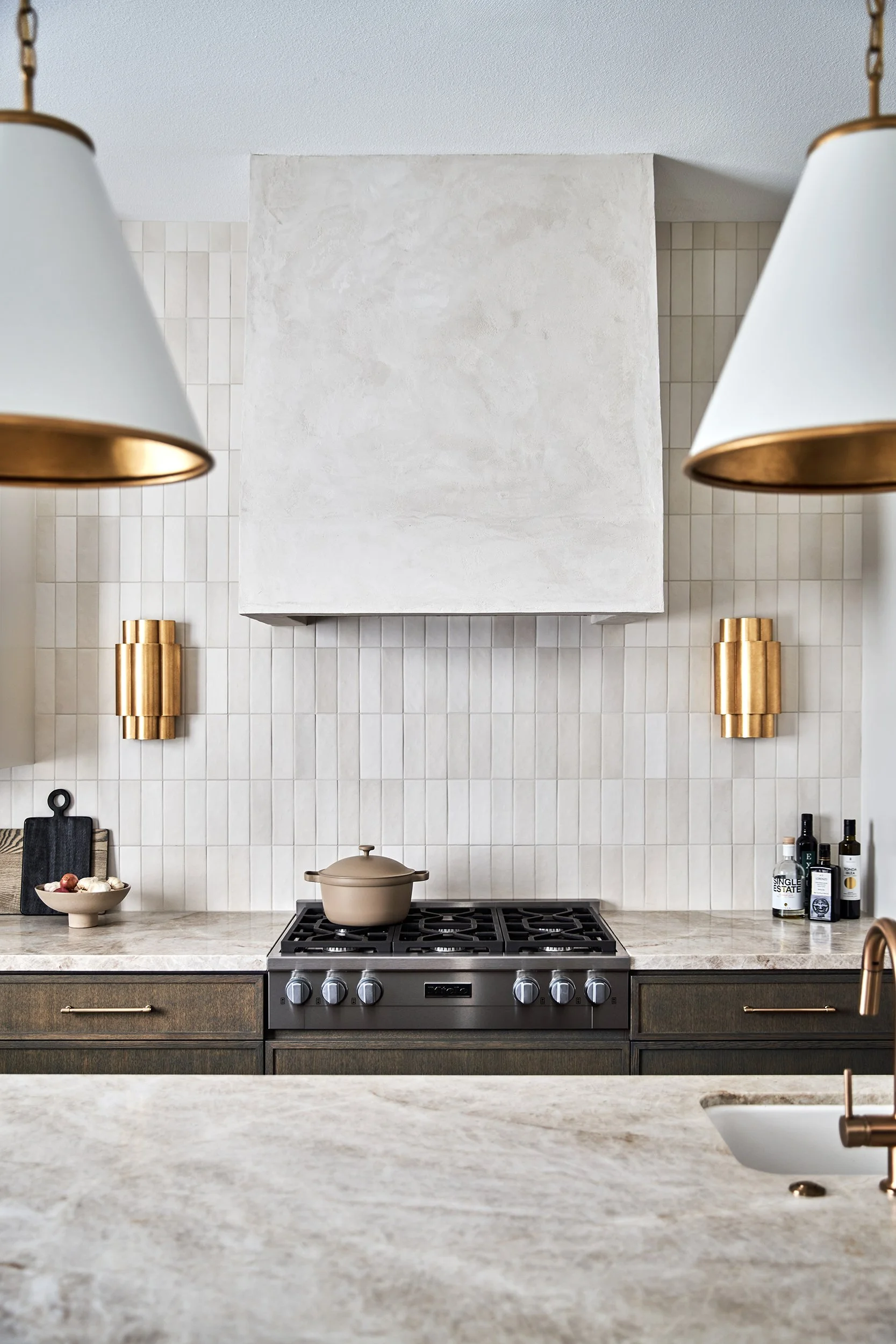 Embarking on this kitchen remodel, we knew we wanted a quieter palette, to modernize and develop expansiveness, and to bring lightness and brightness into the space. We began by squaring the layout and the archways that led in and out of the room. Taking advantage of 11 foot ceilings created a feeling of grandness that draws the eye up and elevates the scale. Smart and expanded cabinetry maximizes storage and daily functionality for the busy working professionals who inhabit the home. Finishes added softness through organic, textural qualities — neutral shades in the honed tile, two-tone millwork is both grounding and light, soft veining offers movement in the quartzite countertops, and the beautiful texture of the plaster range hood whispers like travertine. Accents of natural brass pop a bit of shine.